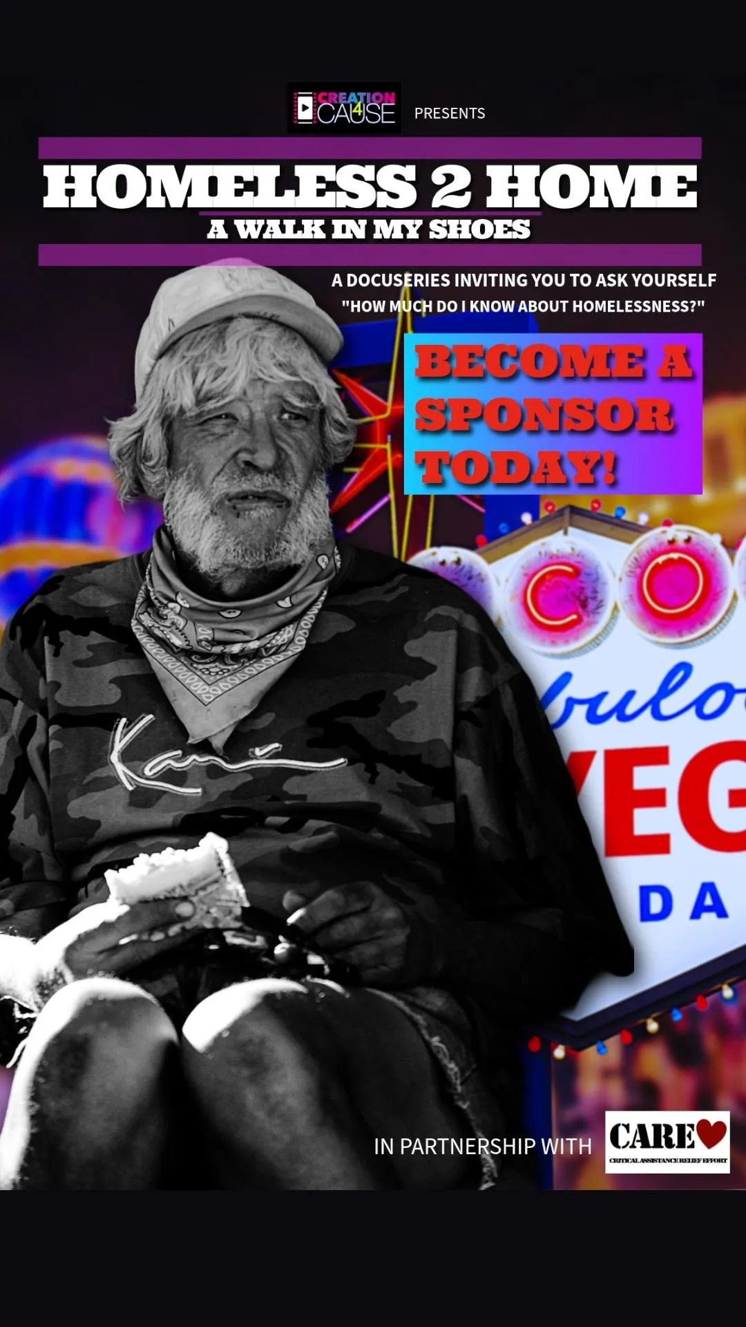 As Creation 4 Cause officially launches as a nonprofit, we’re returning to our roots and confronting a story we know firsthand. Our founding members met in a shelter after experiencing homelessness themselves and committed to building a network for the streets that could change lives when they got out. In celebration of the CARE Complex’s 20th anniversary, this docuseries faces the homelessness crisis in Las Vegas with honesty, urgency, and heart. We aim to humanize people too often overlooked—neighbors who’ve been marginalized and misunderstood—by challenging stereotypes and amplifying real stories that deserve to be seen and heard.
